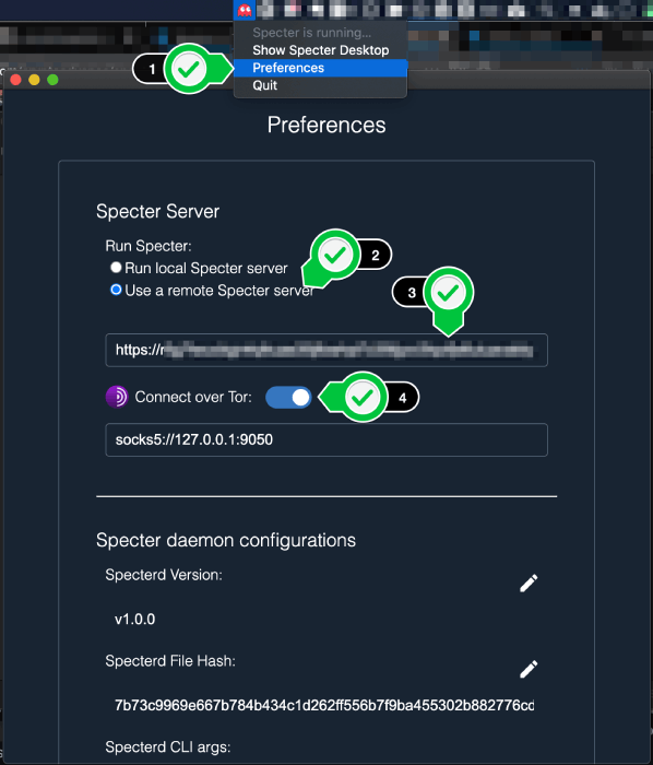 After saving, Specter will shutdown. Start it again and you should be able to connect to your remote Specter server.